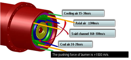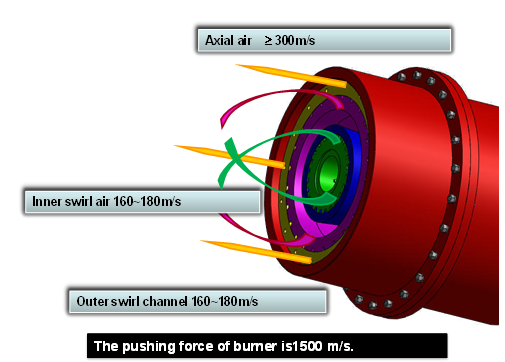 在此基础上,为进一步加强燃料的适应性,公司又开发了双旋流的高性能大推力低一次风量燃烧器,在工程应用中取得了很好的效果。