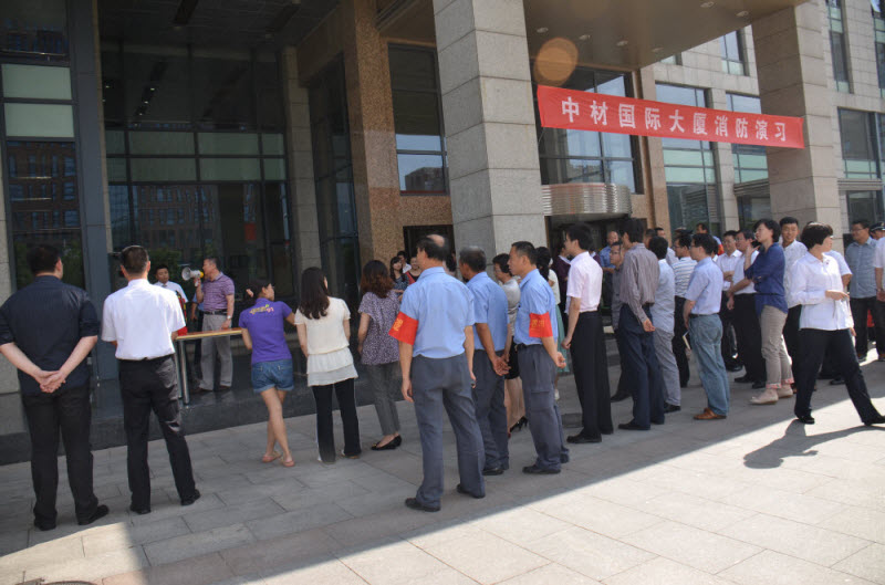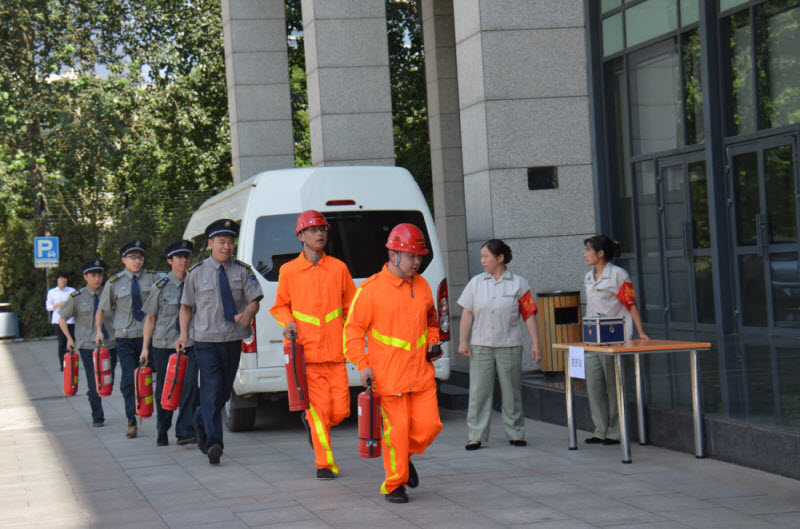 15点,消防疏散演习正式开始,义务消防队员着防火服对起火点进行模拟灭火,并模拟拨打119报火警,大厦内拉响火警警报,员工从疏散楼梯迅速疏散撤离,到指定地点集合,完成预定演习计划。