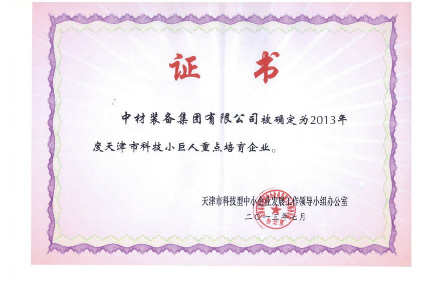 装备集团被天津市科技型中小企业发展工作领导小组办公室评定为2013年度天津市科技小巨人重点培育企业。