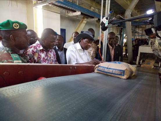 本次视察博尼•亚伊总统主要参观了水泥包装生产线,他亲自操作启动了包装机,并在一袋水泥上签名祝贺NOCIBE水泥生产线顺利投产。
