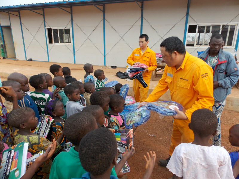 项目副经理昝龙生代表项目部向学生们致以节日的祝福,并向孩子们捐赠了学习用品。学校校长感谢项目部为当地教育事业做出的贡献,孩子们也高兴地喊着MERCI CHINOIS(感谢你们中国朋友)。