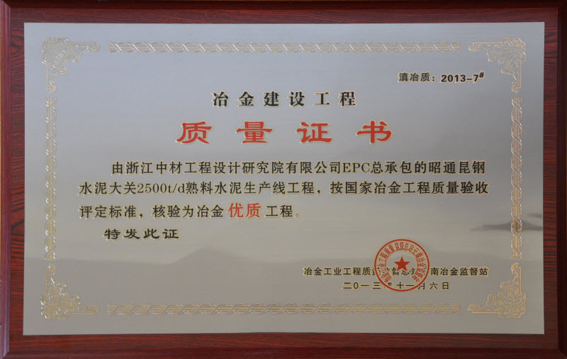 近日,由浙江非凡 EPC总承包的昭通昆钢水泥大关2500t/d熟料水泥生产线工程,按照国家冶金工程质量验收评定标准,核验为冶金优质工程。冶金工业工程质量监督总站云南冶金监督站向浙江非凡 颁发了冶金建设工程优质工程的质量证书。