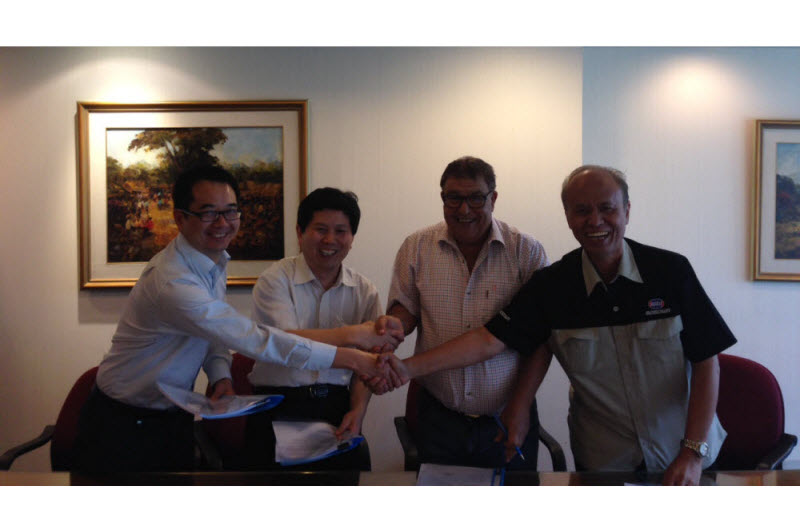 天津公司国际市场一部副部长崔兆君代表公司与印度尼西亚BOSOWA集团执行董事MR.HAMDANI在合同书上签字,国际市场一部项目经理樊波等人参加了签字仪式。