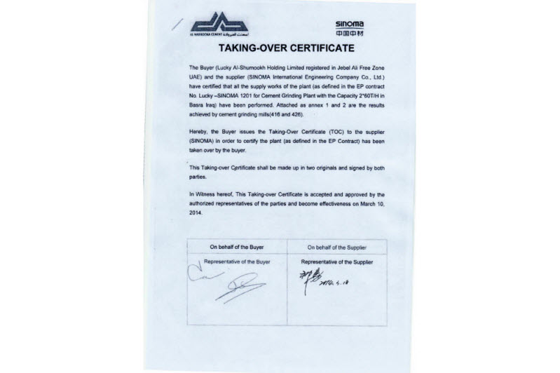 天津公司承建的伊拉克2*60T/H水泥粉磨站生产线获得了业主签发的临时验收证书,标志着整个项目顺利通过业主验收,并全面移交业主。项目正式进入一年质保期。