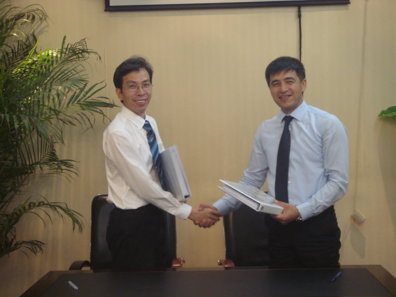 天津公司市场总监曾年明和瓦赫达特水泥公司代表RAKHMONI JAMSHED分别代表各自公司在合同上签字,非凡国际