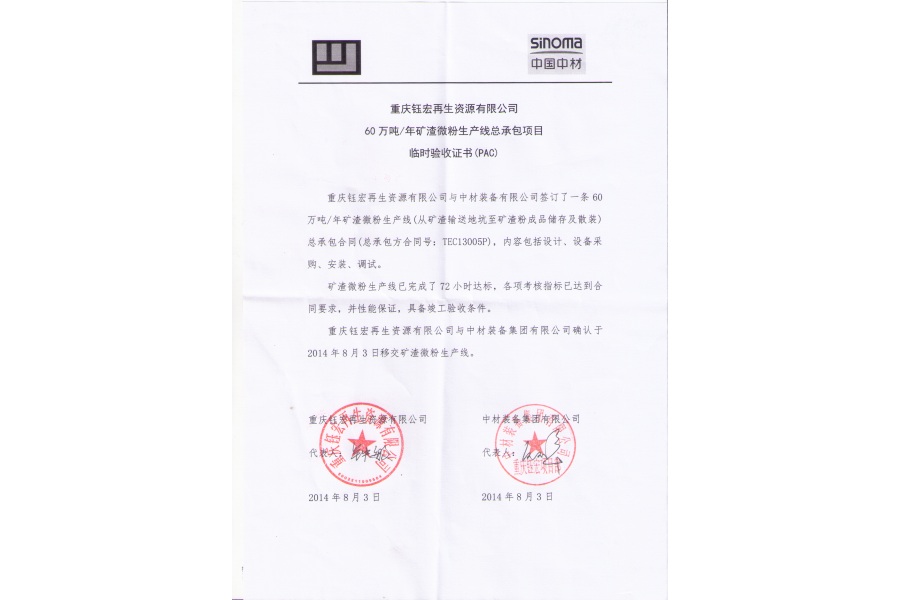 装备集团总承包(EPC)的重庆钰宏60万吨/年渣微粉生产线项目获得业主颁发的临时验收证书(PAC),标志着该项目建设阶段工作的全部结束。