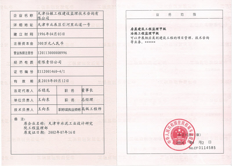 近日,天津水泥工业设计研究院有限公司下属的仕敏监理公司顺利通过了房屋建筑工程专业甲级、冶炼工程甲级资质的审批。