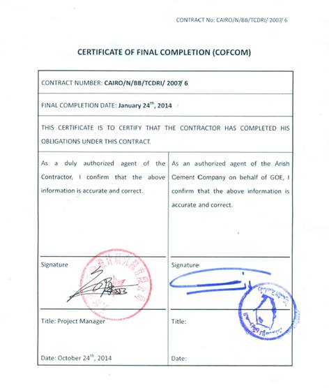 11月10日,在公司领导的关心和支持下,由天津水泥工业设计研究院有限公司总承包的埃及GOE2×5000t/d水泥生产线顺利获得业主颁发的生产线最终验收证书(COFCOM/FAC),这标志着该项目工作圆满结束。