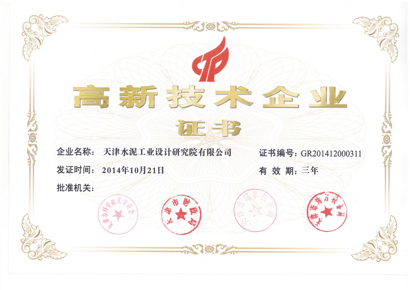 1月15日,天津水泥院有限公司获得了天津市科学技术委员会、天津市财政局、天津市国家税务局和天津市地方税务局联合颁发的《高新技术企业证书》,有效期为三年。按照《中华人民共和国企业所得税法》及国家对高新技术企业的相关税收规定,公司将连续三年享受高新技术企业所得税的相关优惠政策。