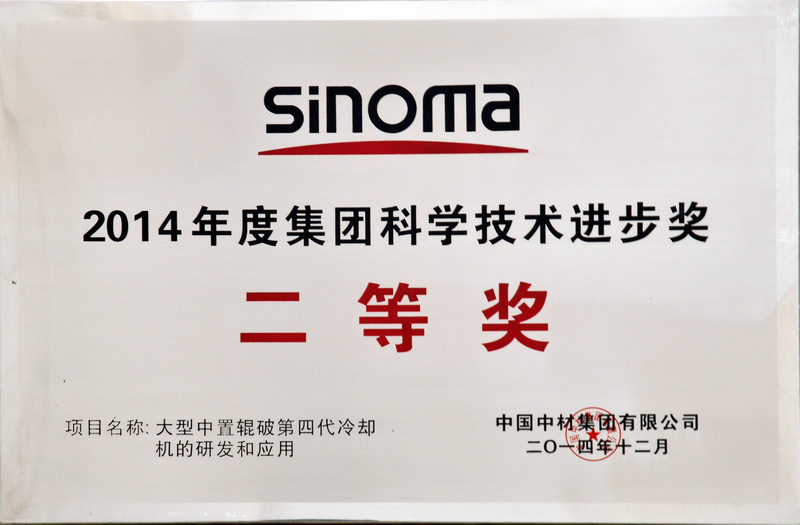 “大型中置辊破第四代冷却机的研发和应用”、“复合污泥脱水调质药剂及污泥深度脱水技术开发与应用”两个项目获得集团科技进步二等奖。“处理高水分电石渣的新型高效水泥技术的研究与应用”、“水泥窑协同处置工业废物及污水工程设计规范研制及应用”、“年产90万吨矿渣立磨设备开发及应用”、“直径2200系列双转子单段锤式破碎机的研发与应用”、“TRPR220-160生料辊压机的研究” “烘干中卸生料磨改造为水泥磨的研究”六个项目获得了集团科技进步三等奖。