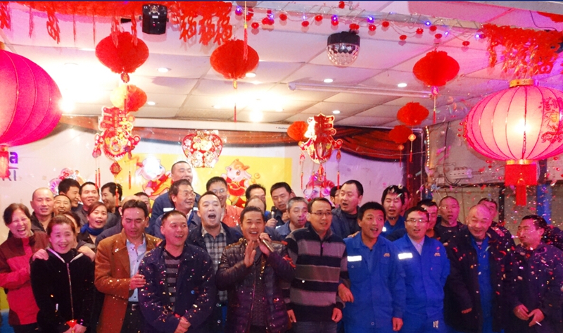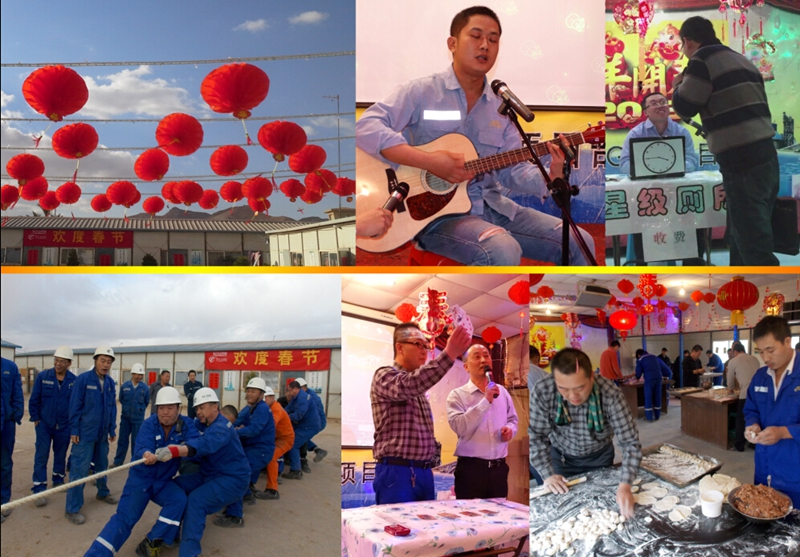 正月初一的一场难得春雨,为新的一年带了一份祝福,春雨过后的夜晚更加明净,项目部餐厅内掌声不断,叫好连连。由员工们自己精心准备的迎新春大联欢精彩上演。幽默调侃的三句半《咱们的GOE》,既道出苦乐的坚守,又对新一年留下期待;小品《如厕奇遇》对垄断行业的乱收费讽刺到位;吉他弹唱《斑马、斑马》委婉动听余音绕梁;魔幻的近景扑克牌魔术让大家匪夷所思连连叫绝;此外还有歌曲演唱,你比划我猜、吹气球、电脑抽奖等节目轮番登场,整场约3个小时的文艺演出让大家大呼过瘾,最后全场同唱《难忘今宵》,用歌声记住这个难忘的夜晚,相约来年同庆。春节期间,项目部还组织开展了卫生宿舍评比、包饺子比赛、拔河对抗赛、电影展映等其他文体活动。
