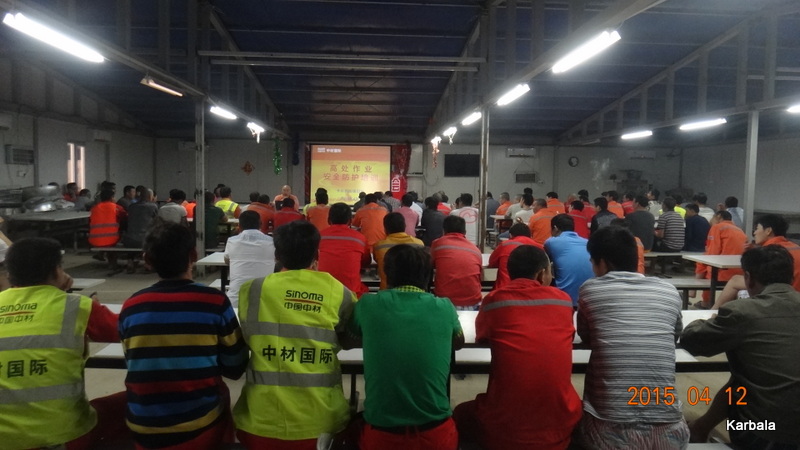 随着项目施工中高处作业面的增多,为提高员工们在高处作业中的安全防范意识,卡尔巴拉项目部于2015年4月11日和12日晚,分两批次对项目全体员工进行了高处作业安全防护的培训。