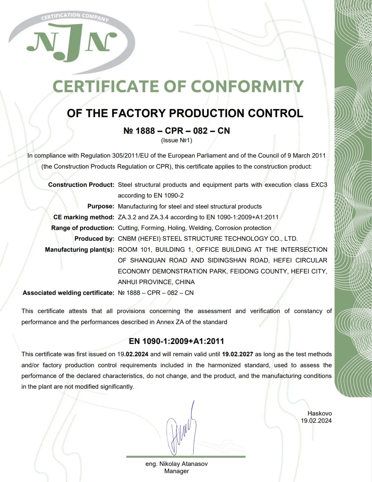装备集团所属中建材钢构公司荣获欧洲权威的CE认证、“肥东县2023年度建筑房地产业10强”称号。